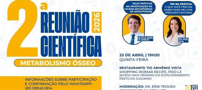 O encontro será coordenado pelo presidente da SBEM PE, Dr. Erik Trovão, e será sobre metabolismo ósseo.